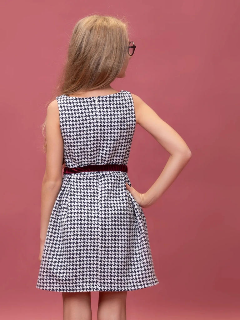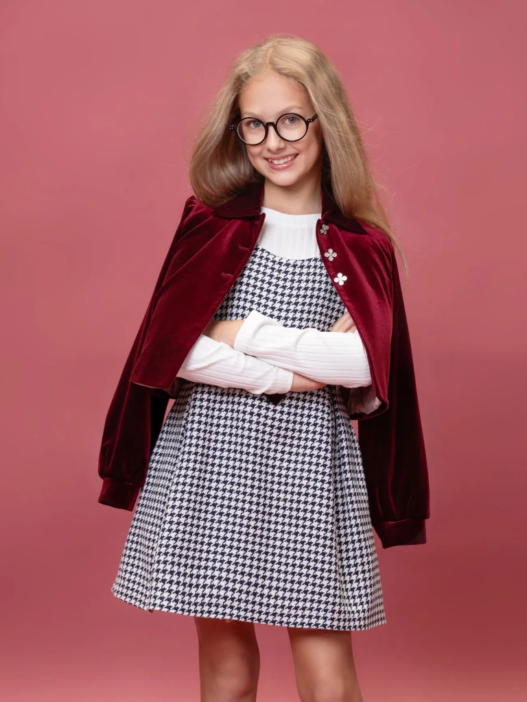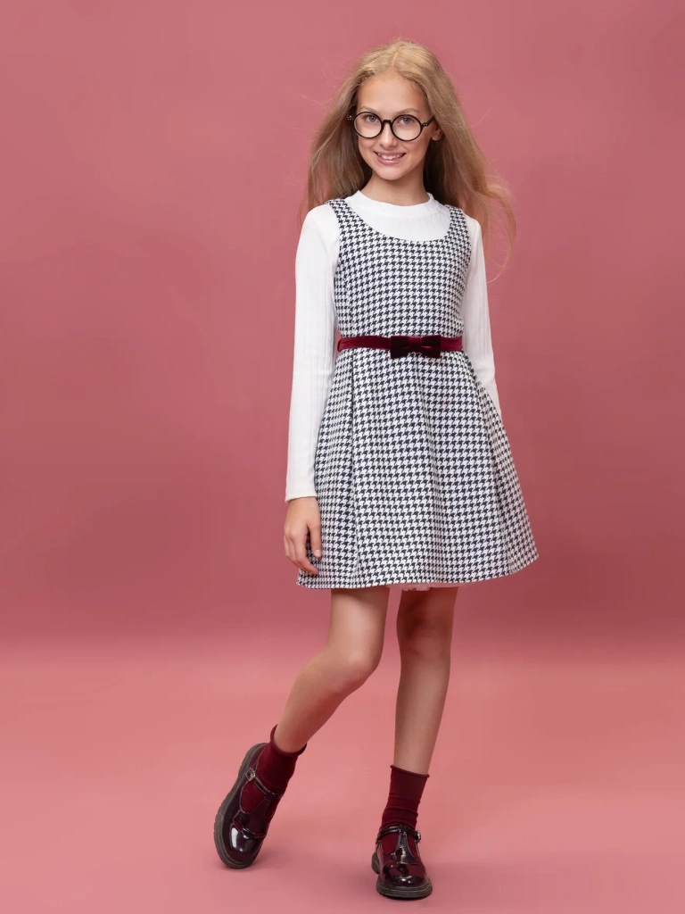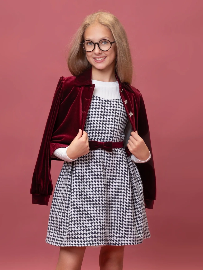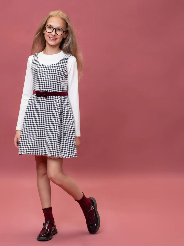 Сарафан из фактурного твида станет основой любого элегантного образа. Съемный бархатный пояс с аккуратным бантом превратит сарафан в празднично-торжественный, когда без пояса можно создать утонченно-повседневный наряд
