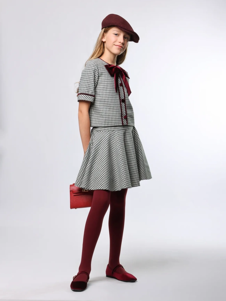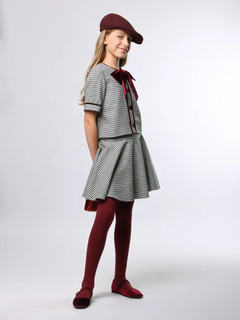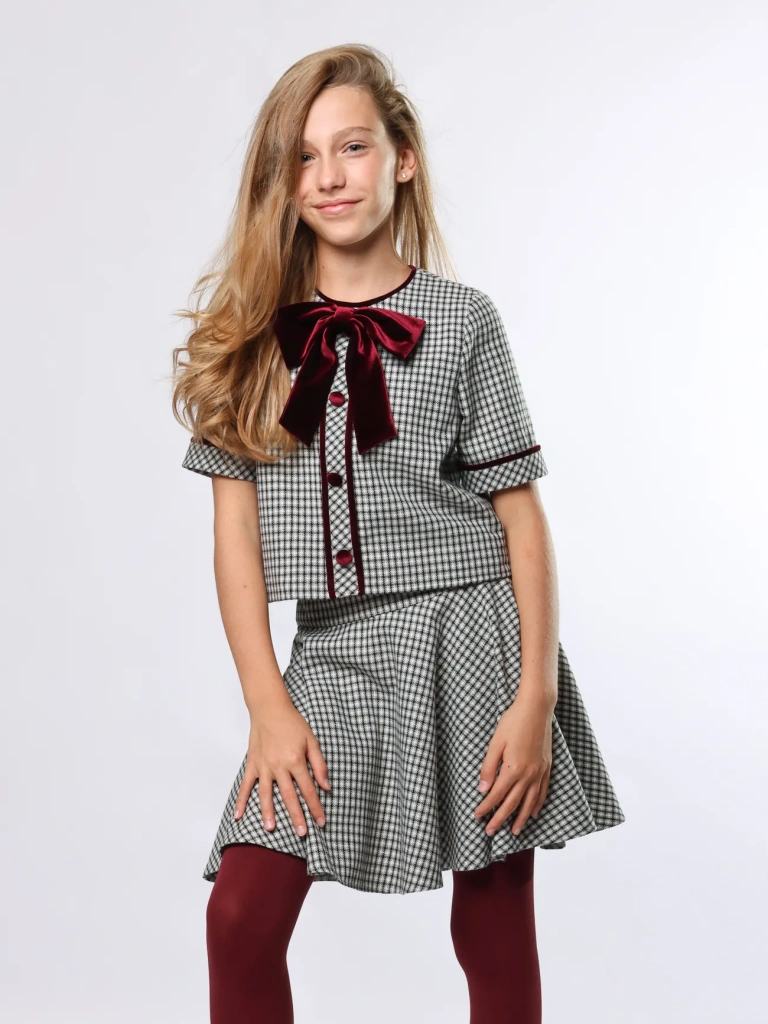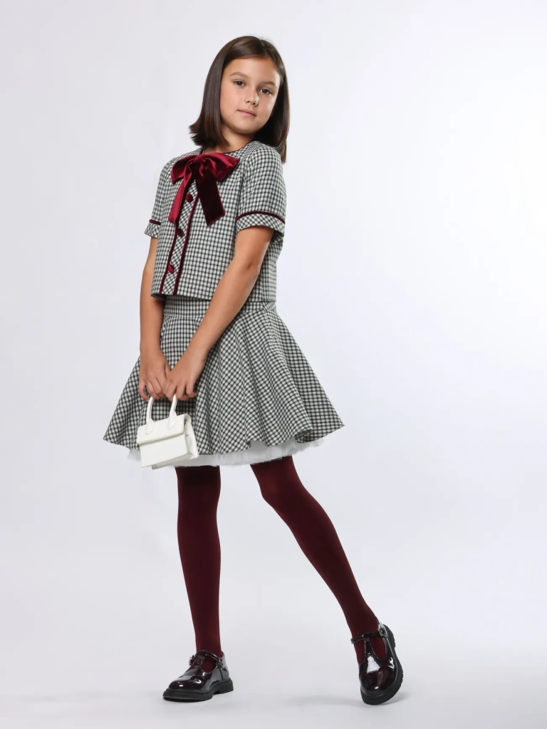 Романтичный комплект – жакет прямого кроя и юбка-солнце на кокетке. Сочетание элегантности и кокетства привлечет восторженные взгляды.
