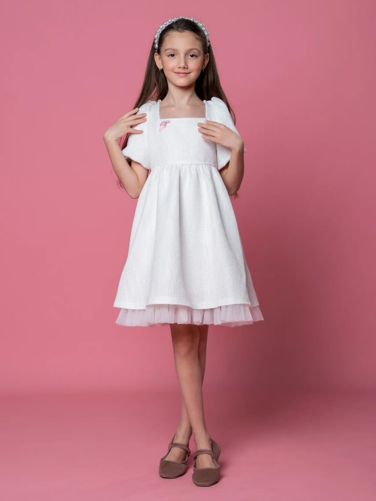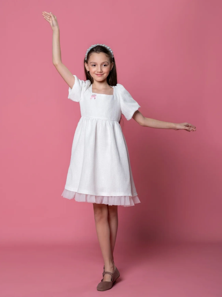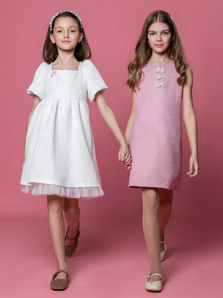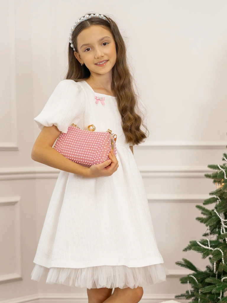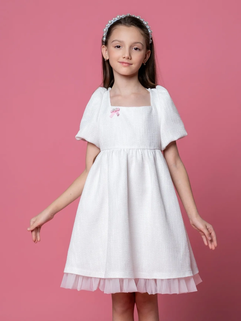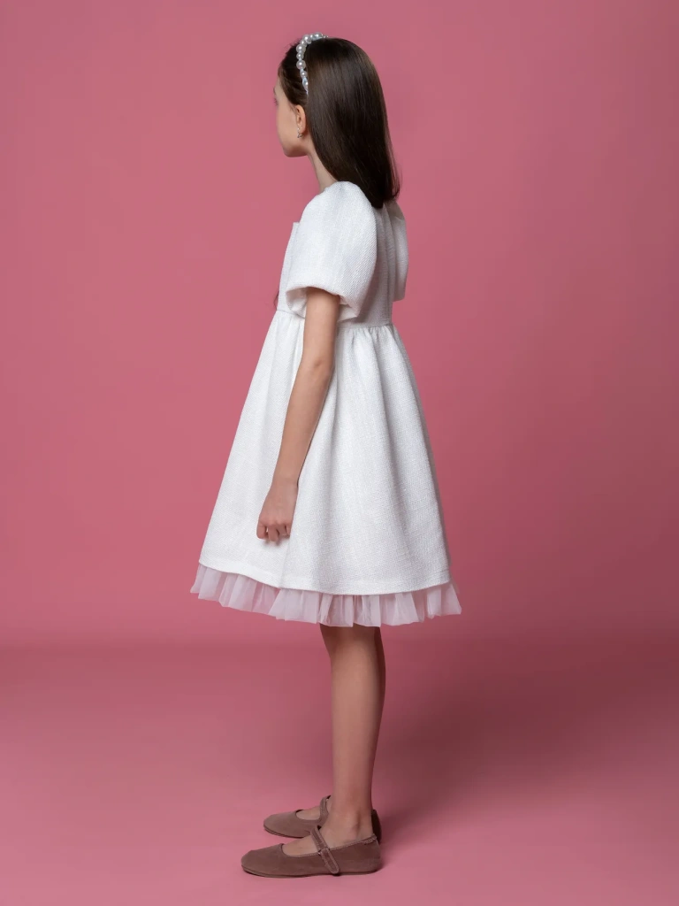 Очаровательное платье из твида с объемными рукавами и завышенной талией. Платье создает легкий и воздушный образ, объемные рукава добавляют нотку винтажного шика.