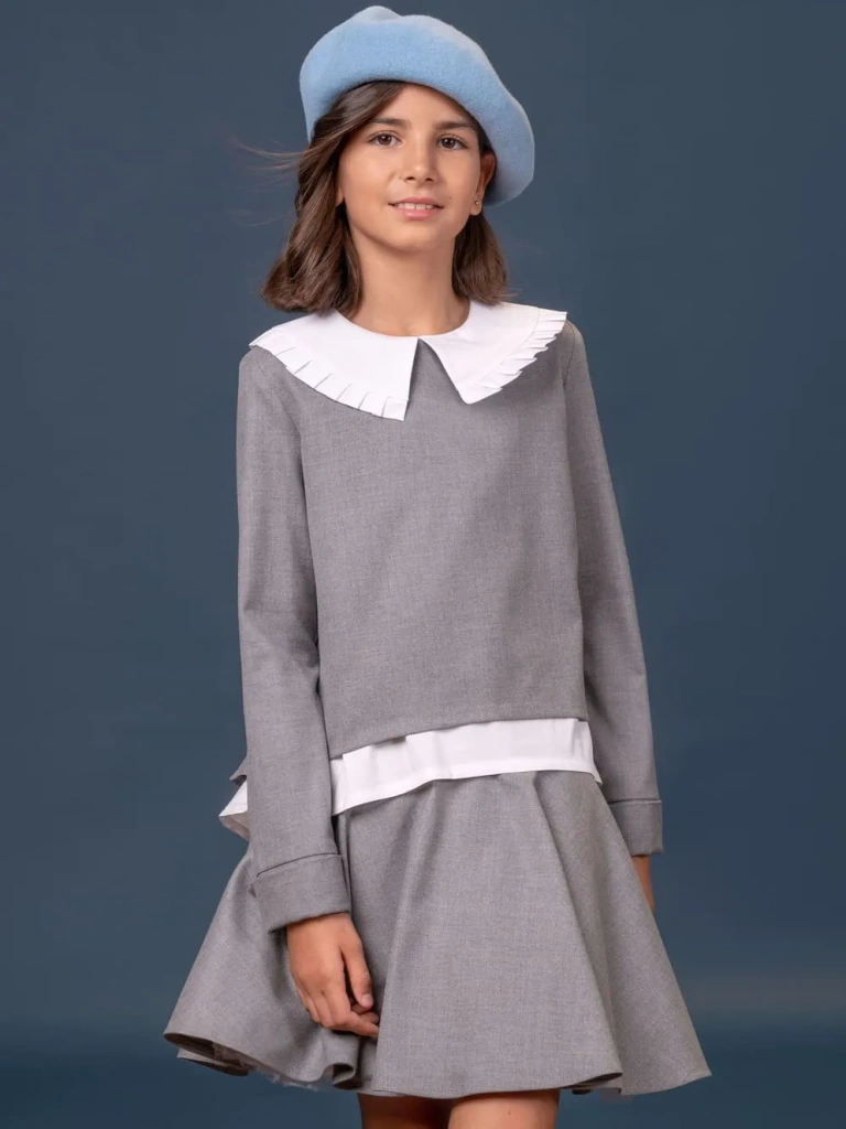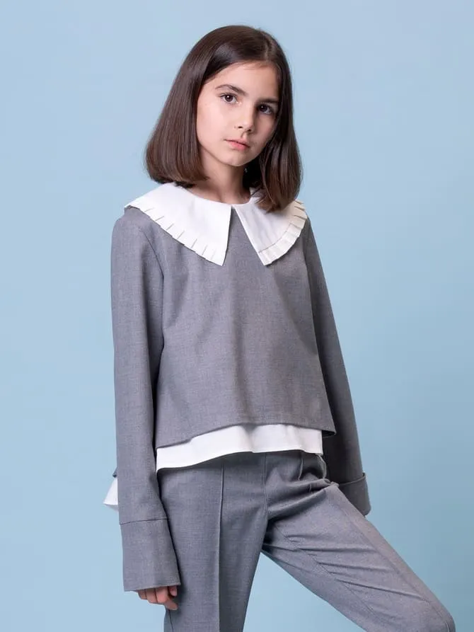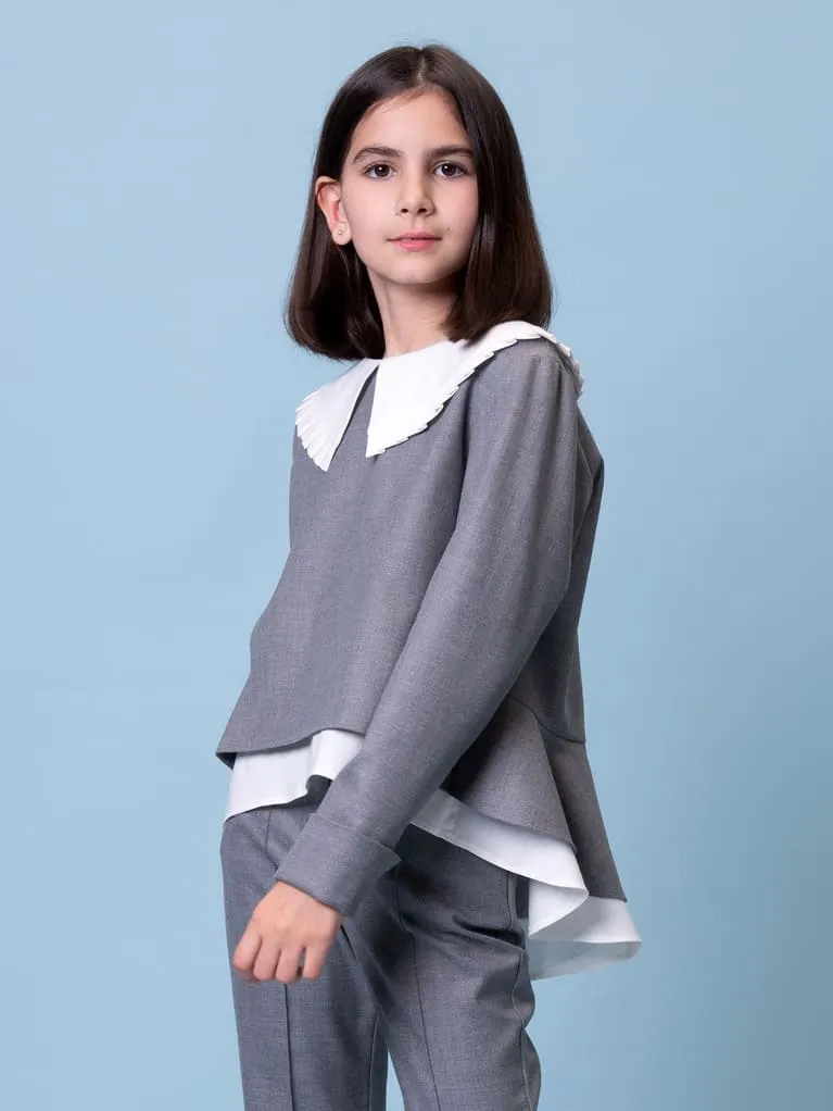 Двойная блуза с акцентным воротником – универсальный предмет гардероба, с помощью которого можно создать как минимум три образа. Модель состоит из верхней и нижней блуз, каждая из которых может выступать самостоятельным предметом одежды. Нижняя блуза, выполненная из 100-процентного хлопка, комбинируется практически с любым верхом: ее можно надевать под платья, жакеты, пиджаки или свитшоты, создавая комфортные и гармоничные аутфиты. Верхняя блуза изготовлена из премиальной костюмной ткани, благодаря которой отлично сохраняет внешний вид. Эта часть модели имеет рукав с манжетой и расклешенный волан по низу, что делает ее романтичной и оригинальной. Изюминка блузы – воротник с оборкой, обеспечивающий модели праздничный вид.