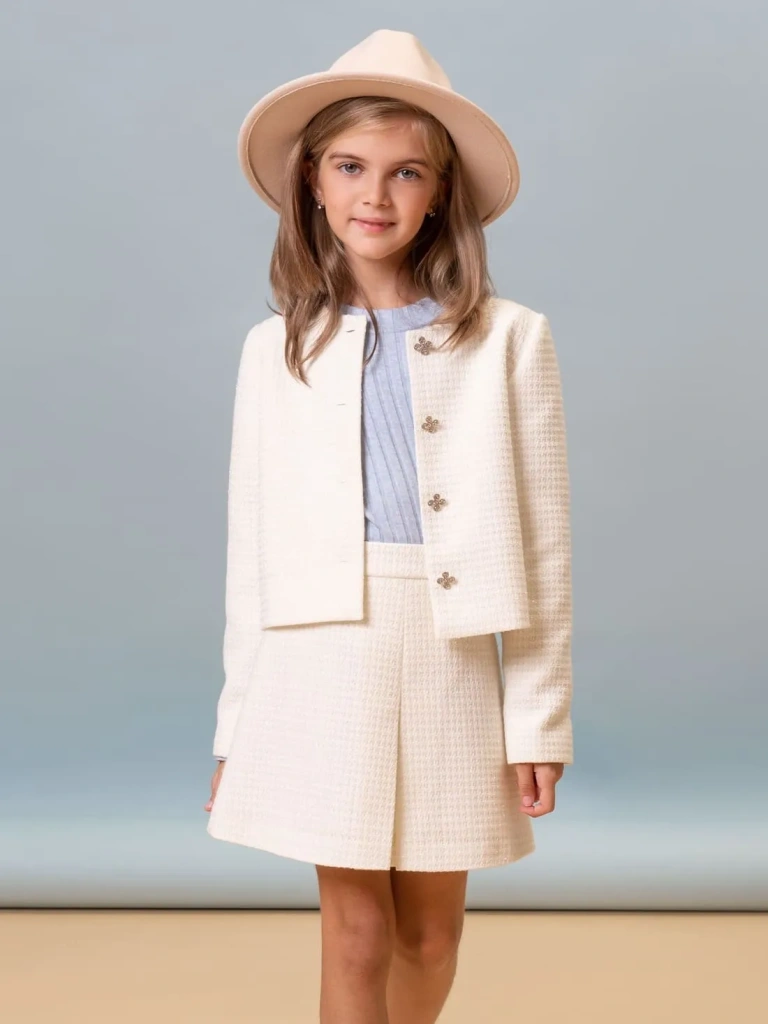 Для создания комплекта идеально подходят мини-шорты для горчичного жакета (артикул 7235033) и юбка-трапеция для молочного жакета (артикул 7235044).