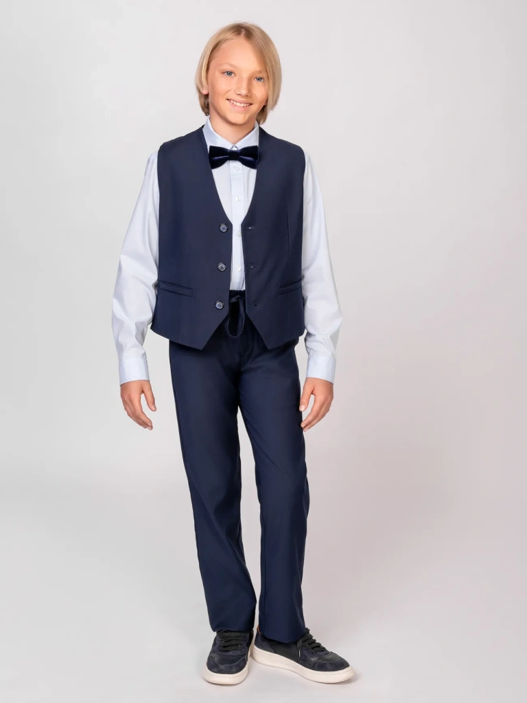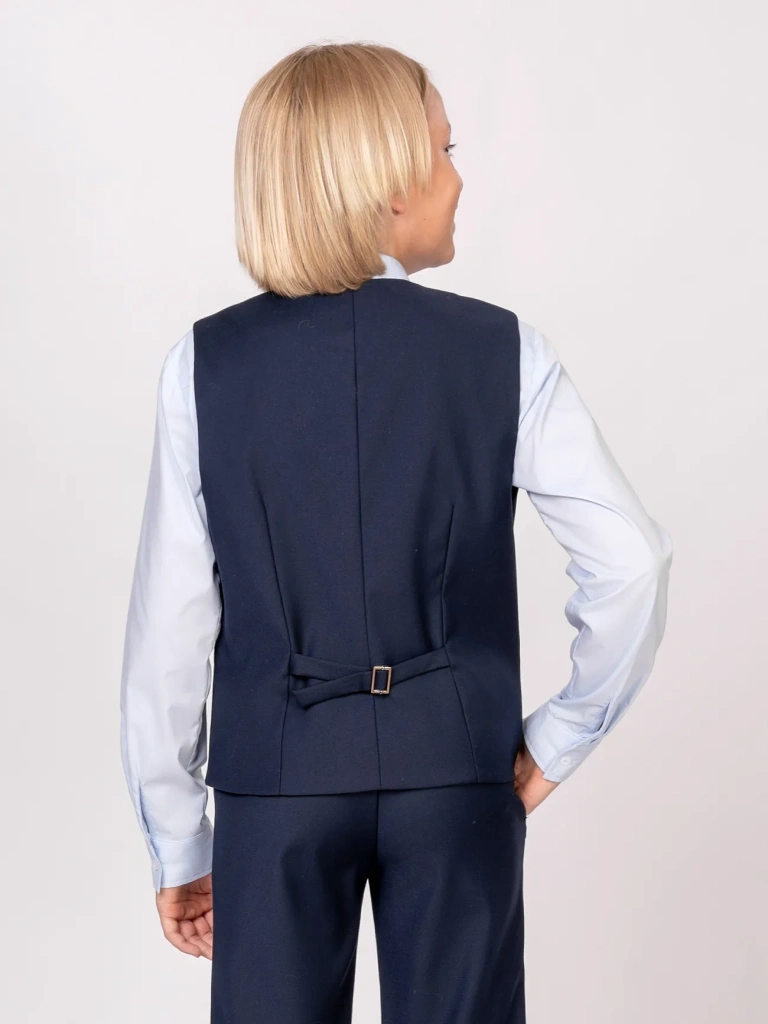 Классический однобортный жилет для мальчика прекрасно впишется в школьный гардероб. Идеальную посадку обеспечивают талиевые вытачки и хлястик с пряжкой. Жилет может как завершить официальный образ с брюками и рубашкой, так и добавить изюминку в повседневный образ с футболкой, поло или джинсами.