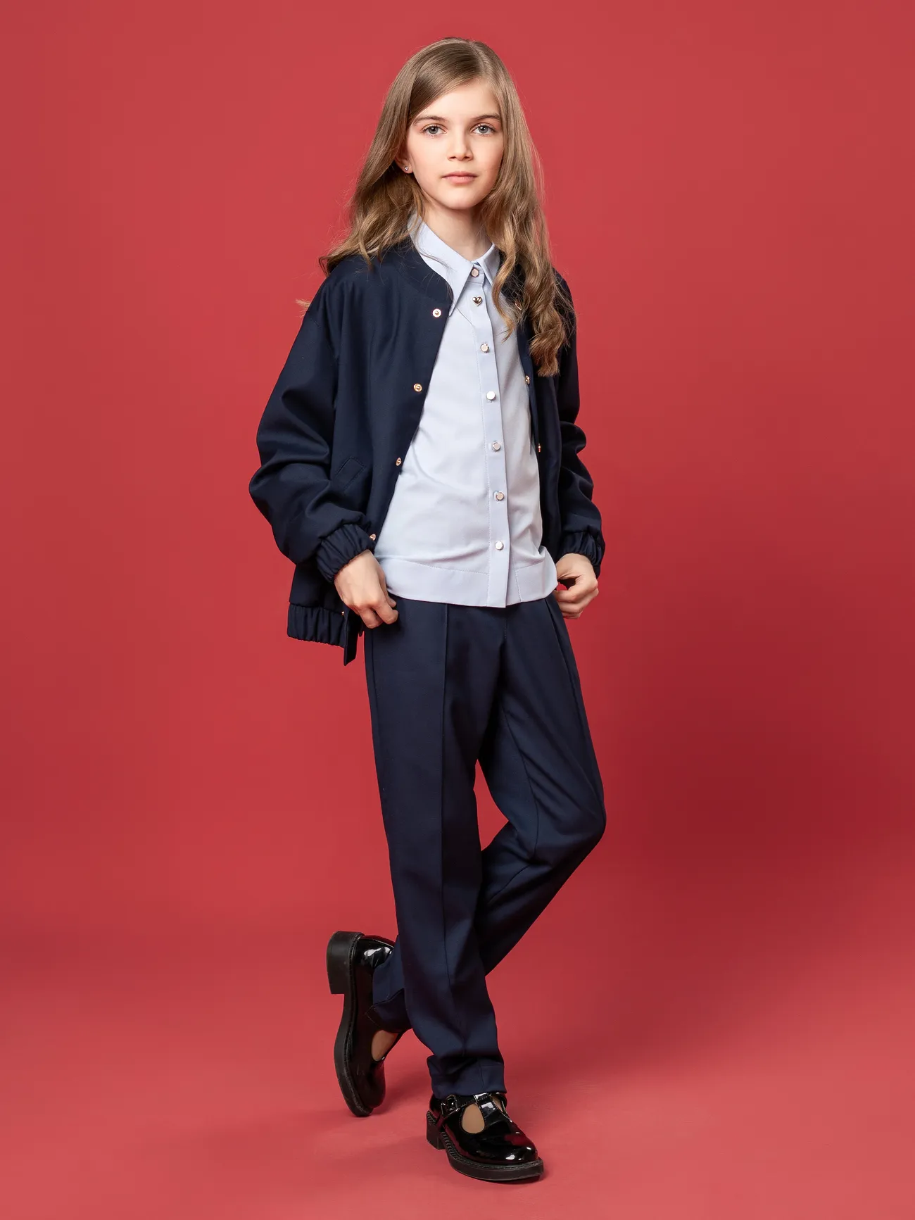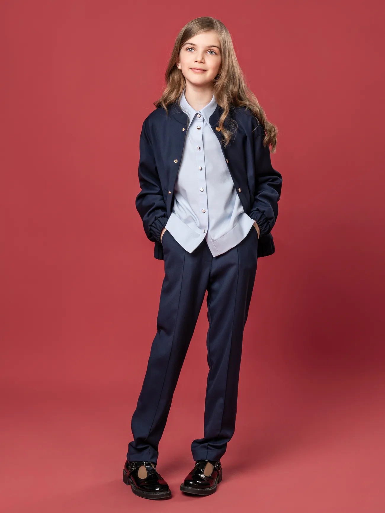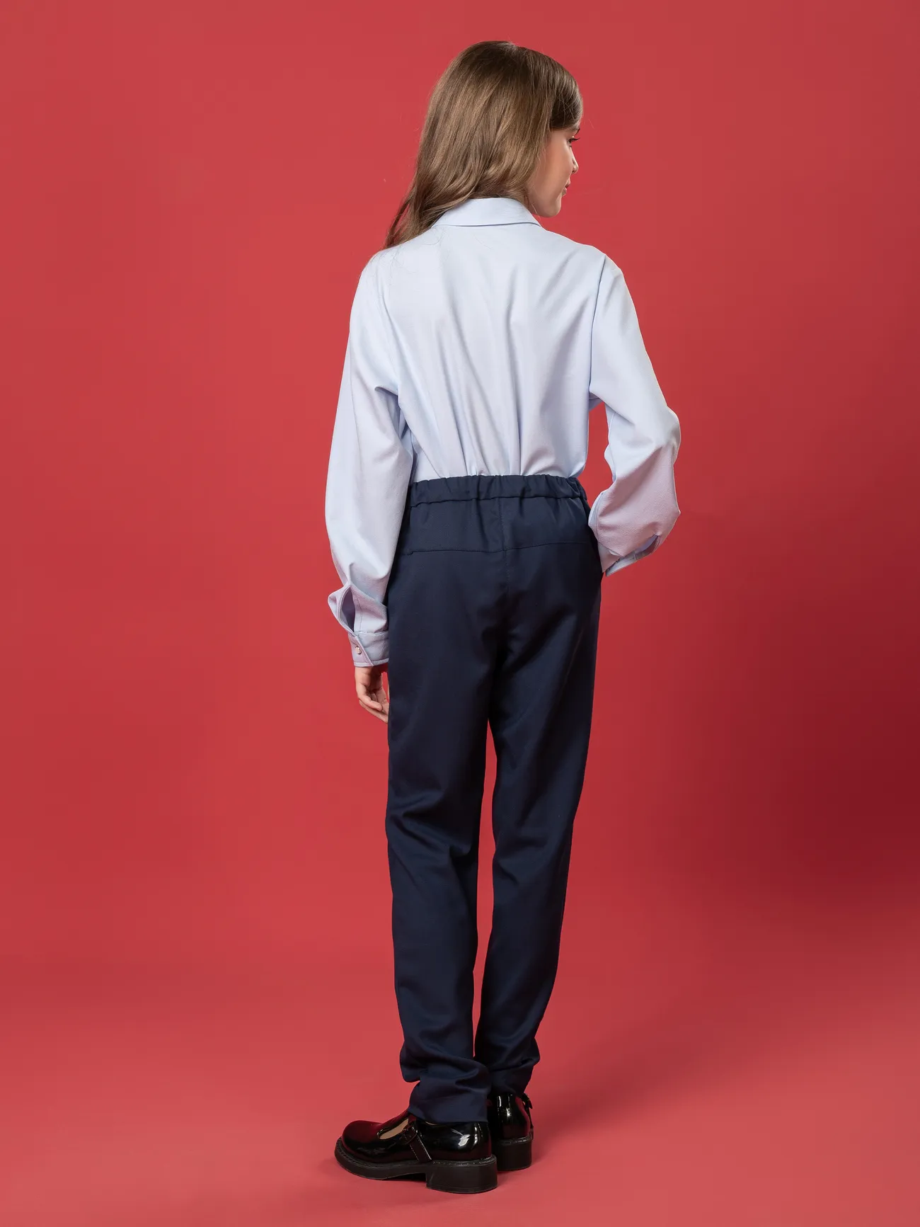 Школьные прямые брюки с простроченными стрелками – отличная база для гардероба девочки. Строгие и комфортные, они хорошо сочетаются со свитшотами, блузами и жилетами Ole!twice, вписываются как в повседневные, так и в официальные образы. Модель хорошо садится на фигуры разного типа благодаря утяжке на поясе и идеальному лекалу.