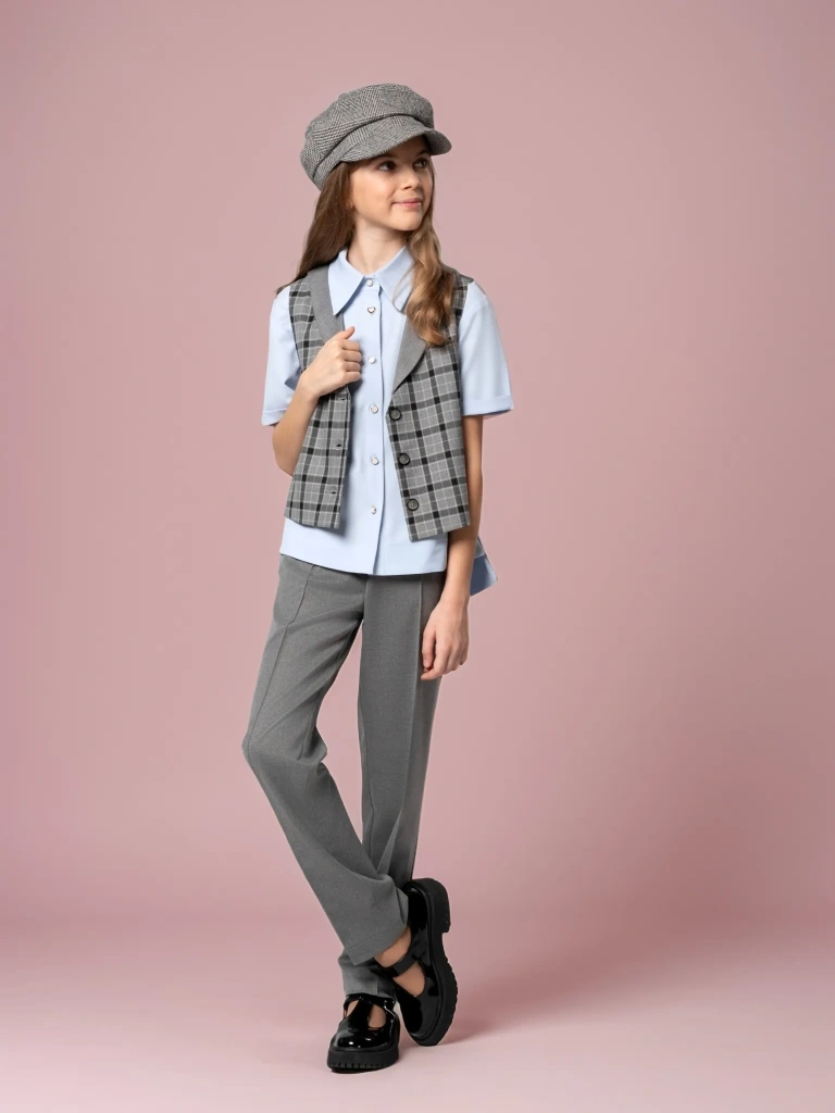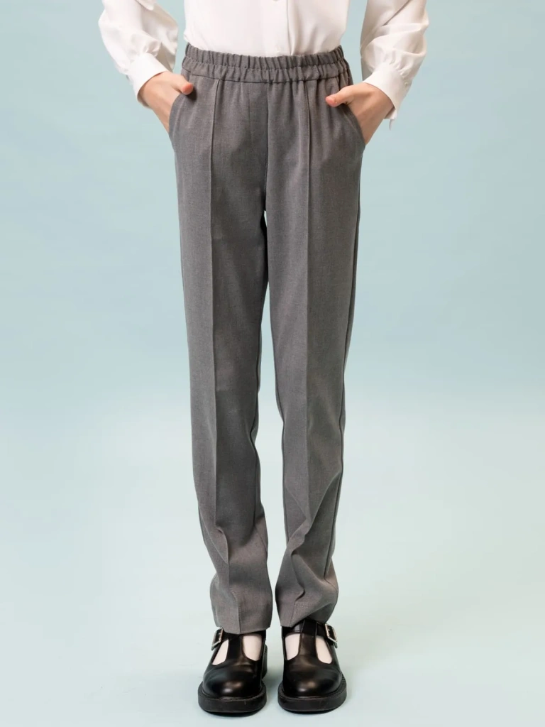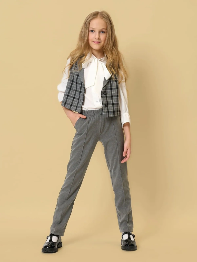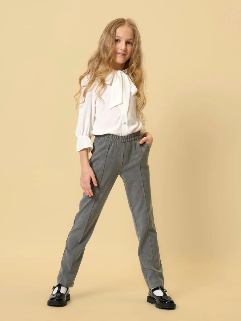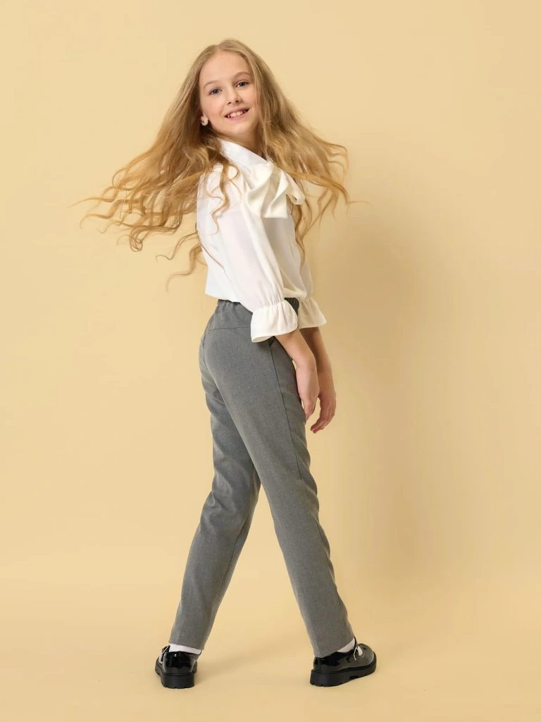 Школьные прямые брюки с простроченными стрелками – отличная база для гардероба девочки. Строгие и комфортные, они хорошо сочетаются со свитшотами, блузами и жилетами Ole!twice, вписываются как в повседневные, так и в официальные образы. Модель хорошо садится на фигуры разного типа благодаря утяжке на поясе и идеальному лекалу.
