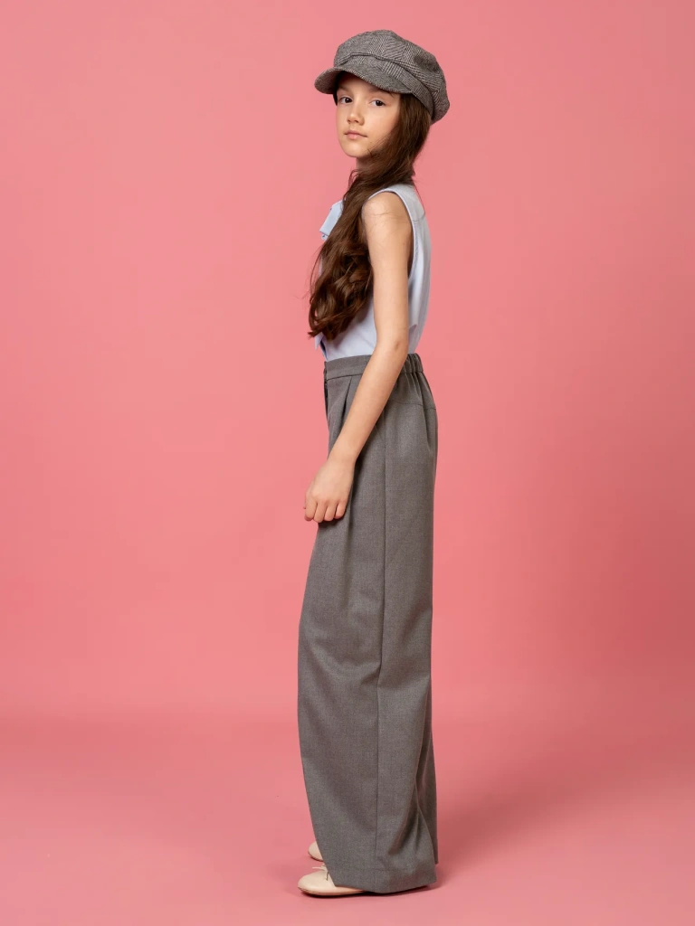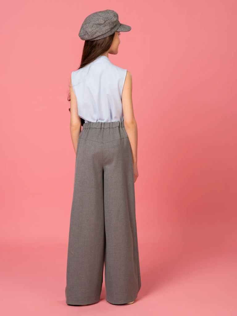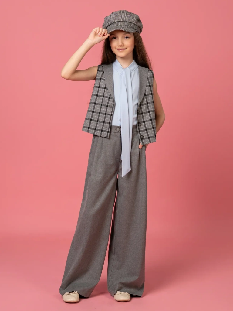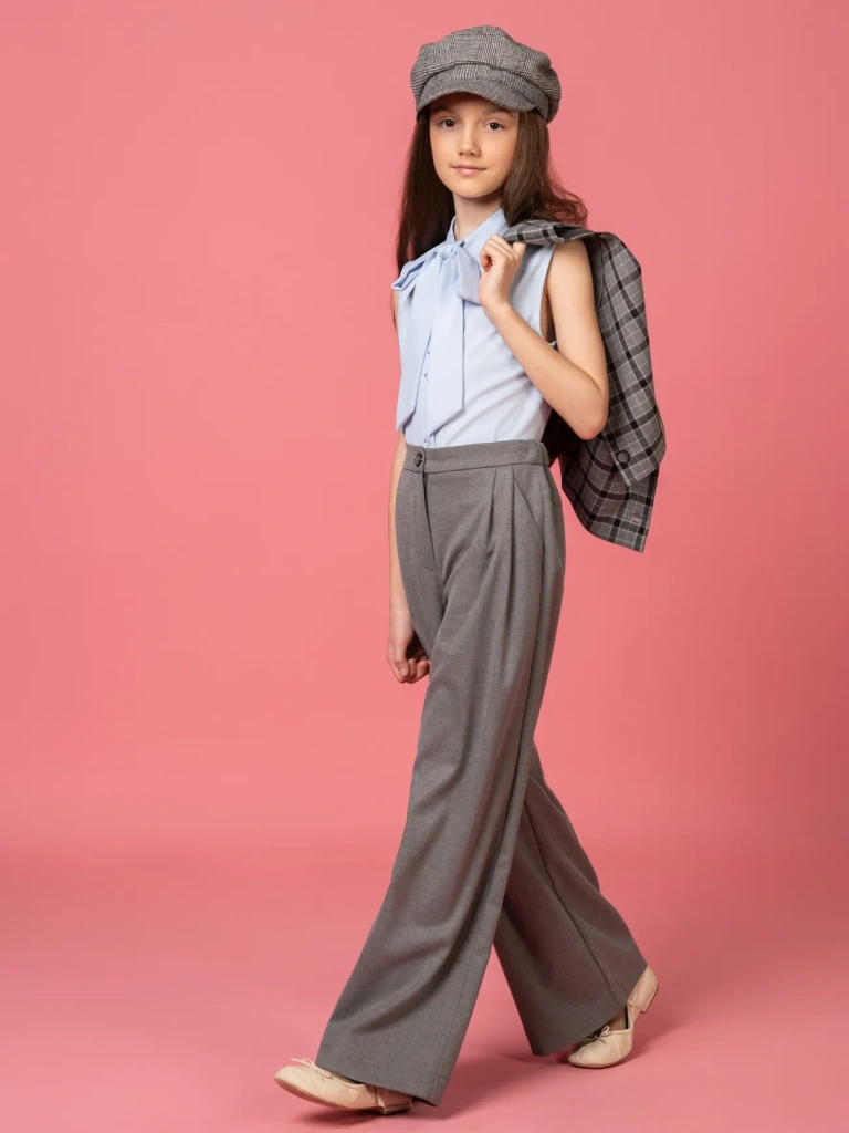 Широкие брюки – для школы, для прогулок, для нарядных образов. Модель палаццо с высокой посадкой – удобная, стильная и универсальная. Фасон брюк отличается широкими длинными штанинами, что позволяет зрительно удлинять силуэт. Свободный крой модели не стесняет движений во время ходьбы, придавая изящность и легкость образу. Брюки станут отличной школьной базой, они идеально сочетаются с блузами, жилетами, жакетами и бомберами Ole!twice.