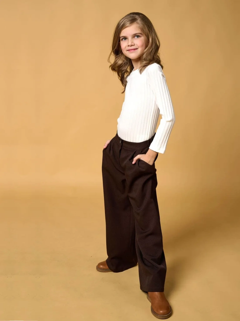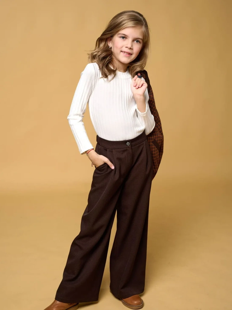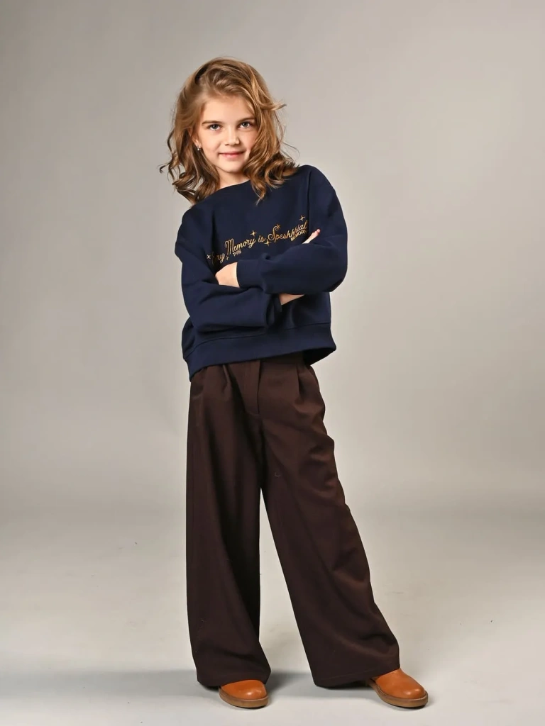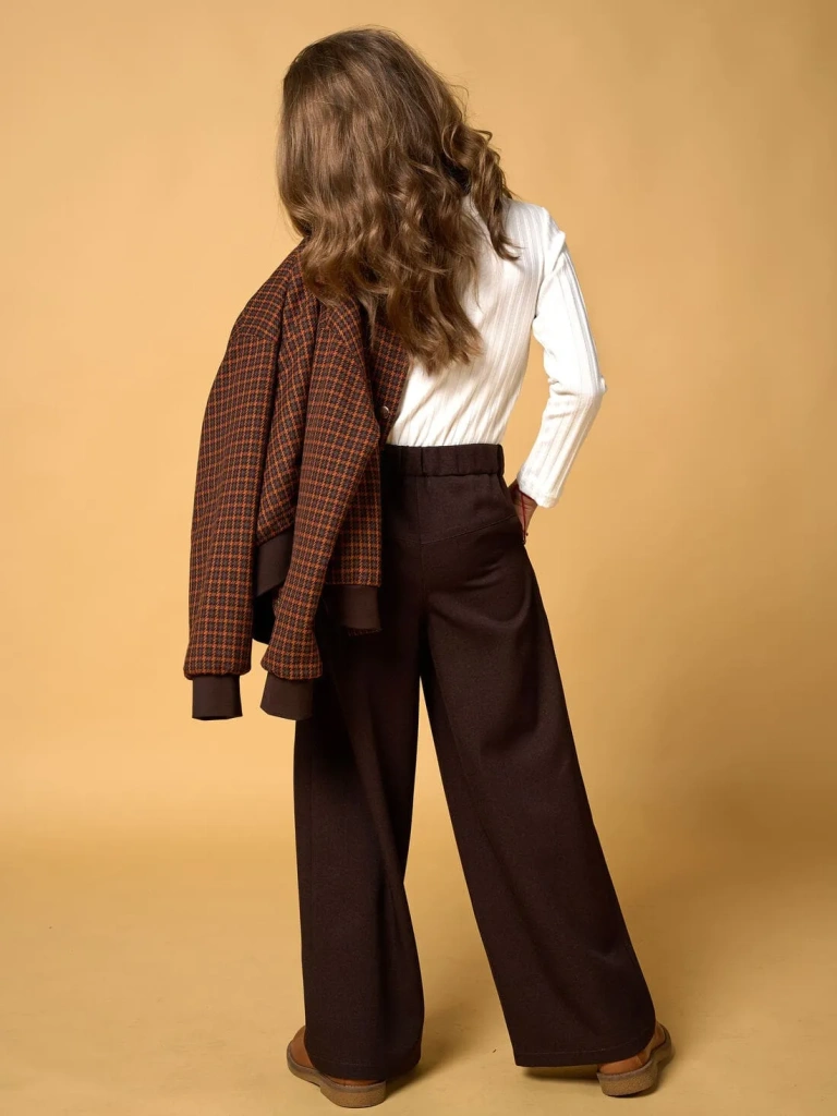 Широкие брюки – для школы, для прогулок, для нарядных образов. Модель палаццо с высокой посадкой – удобная, стильная и универсальная. Фасон брюк отличается широкими длинными штанинами, что позволяет зрительно удлинять силуэт. Свободный крой модели не стесняет движений во время ходьбы, придавая изящность и легкость образу. Брюки станут отличной школьной базой, они идеально сочетаются с блузами, жилетами, жакетами и бомберами Ole!twice.