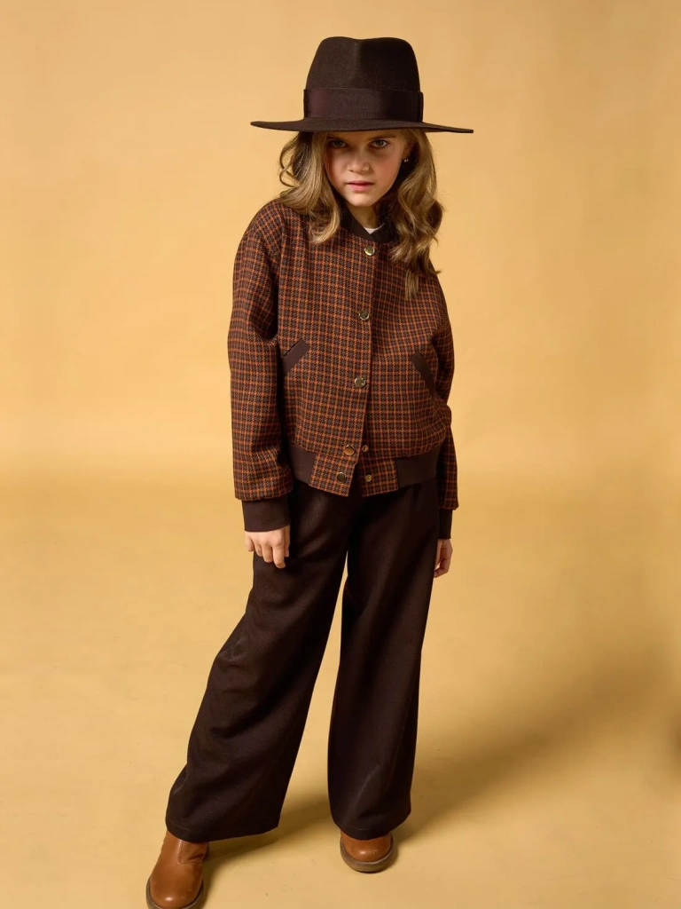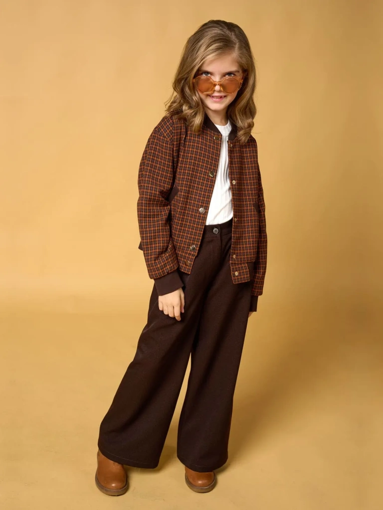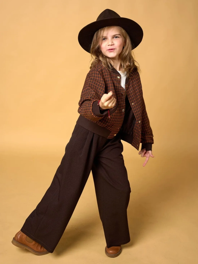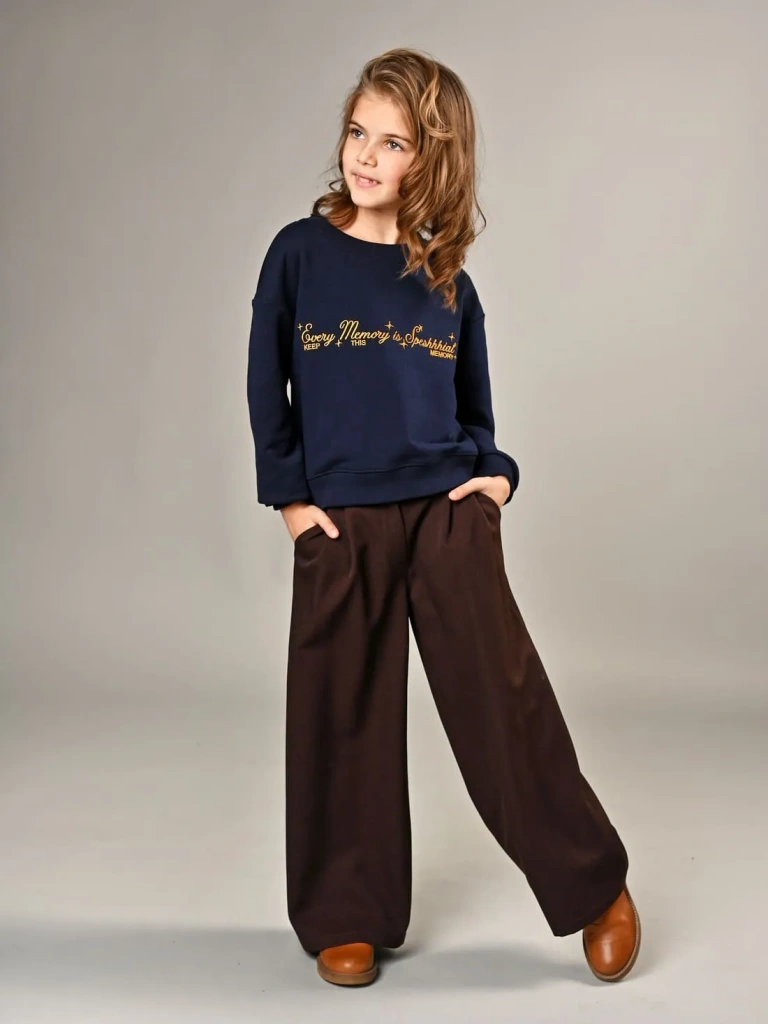 Широкие брюки – для школы, для прогулок, для нарядных образов. Модель палаццо с высокой посадкой – удобная, стильная и универсальная. Фасон брюк отличается широкими длинными штанинами, что позволяет зрительно удлинять силуэт. Свободный крой модели не стесняет движений во время ходьбы, придавая изящность и легкость образу. Брюки станут отличной школьной базой, они идеально сочетаются с блузами, жилетами, жакетами и бомберами Ole!twice.
