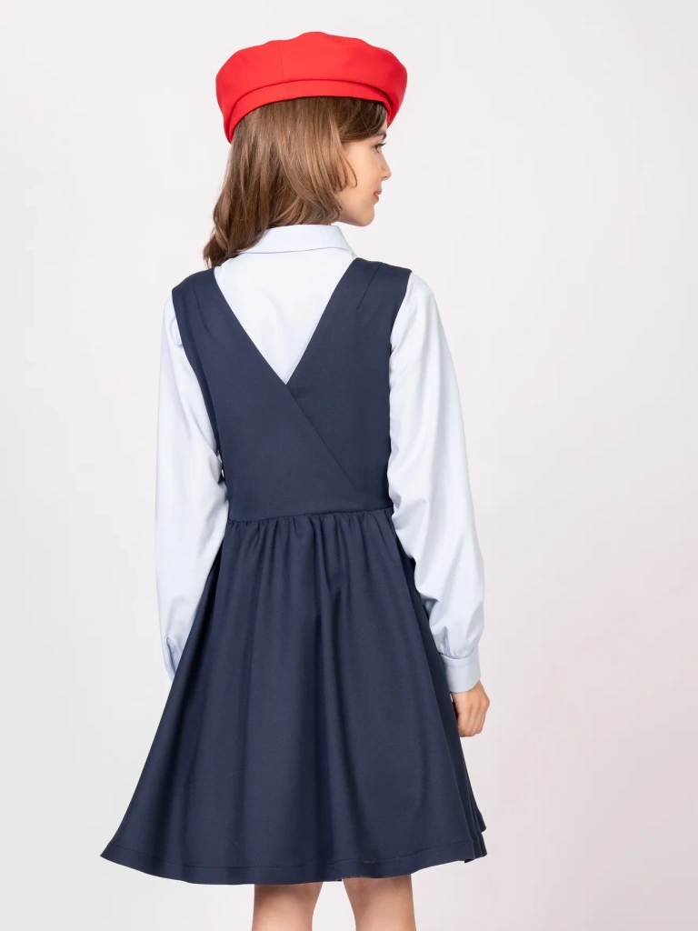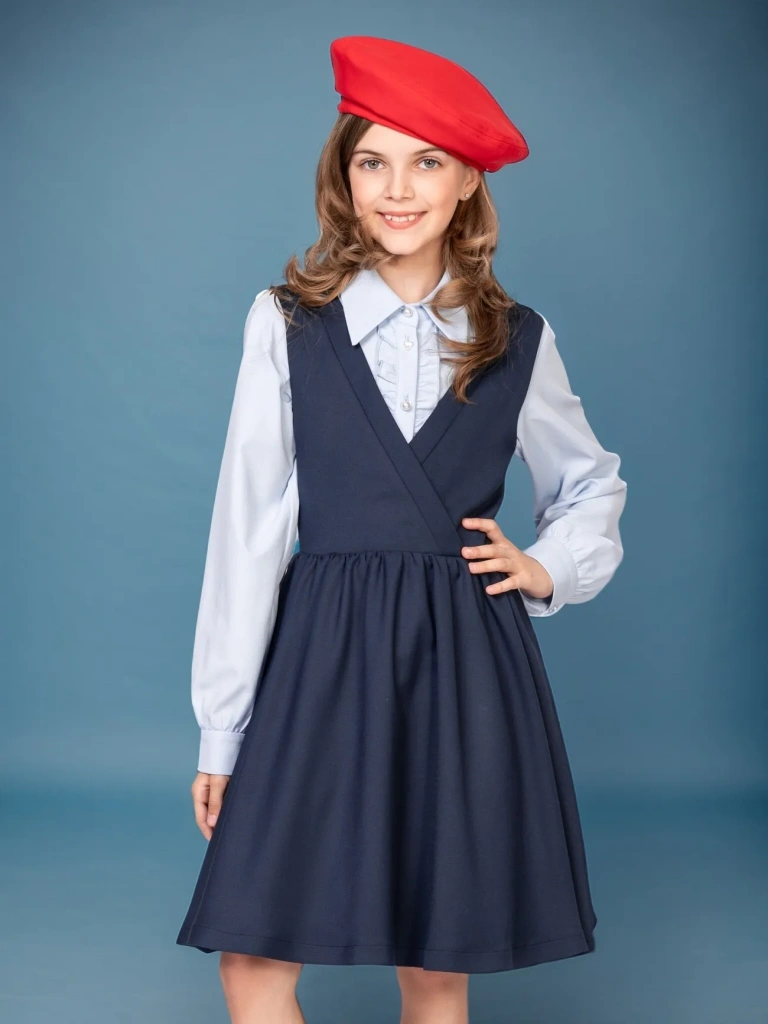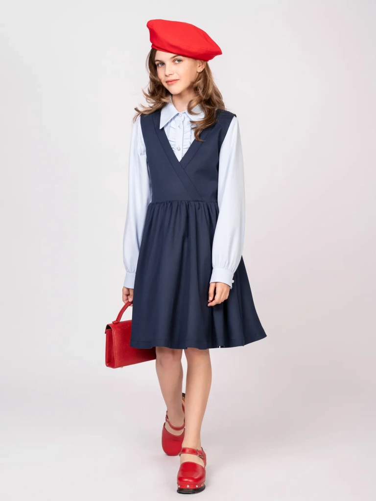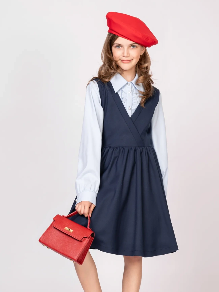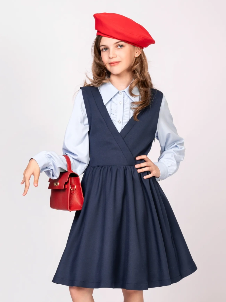 Школьный сарафан приталенного силуэта с запАхом в верхней части - бессменный хит продаж! Модель станет любимым предметом школьного гардероба и позволит создать большое количество образов: от нарядных и официально-деловых с блузами до расслабленных и повседневных с футболками и водолазками.